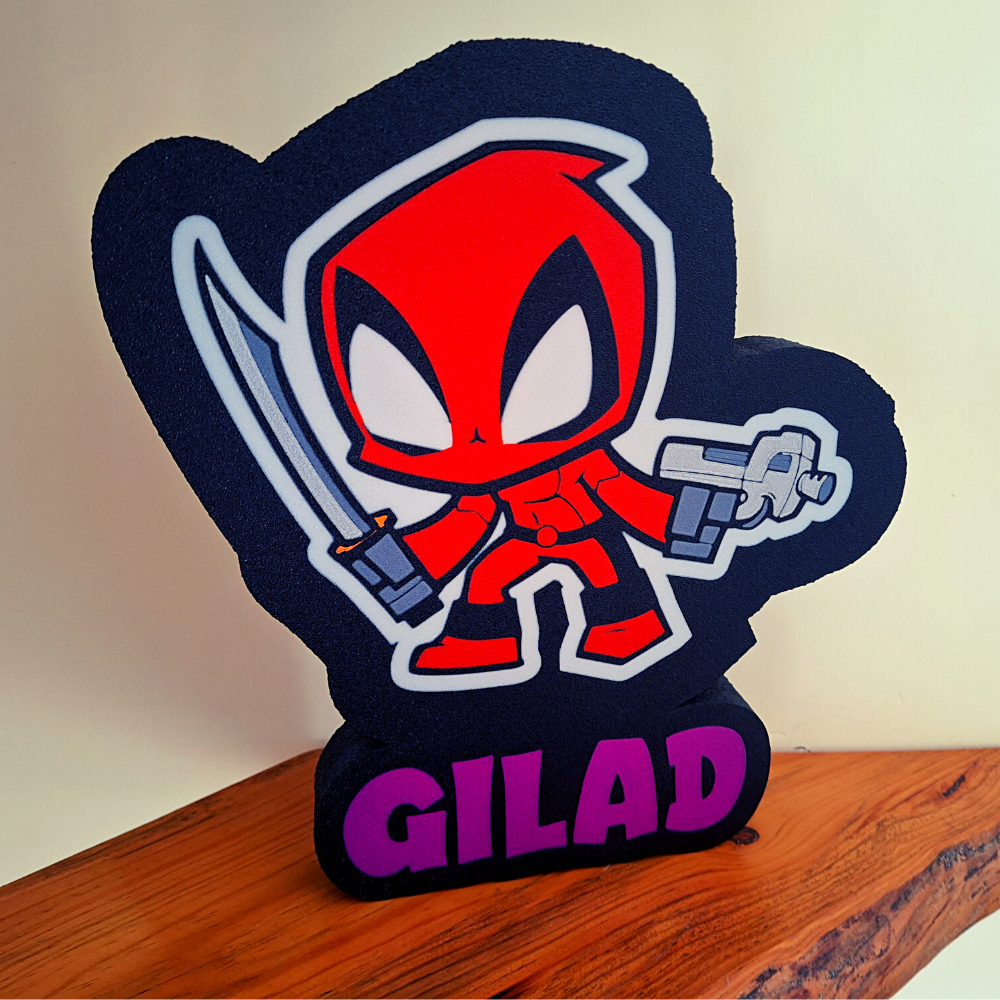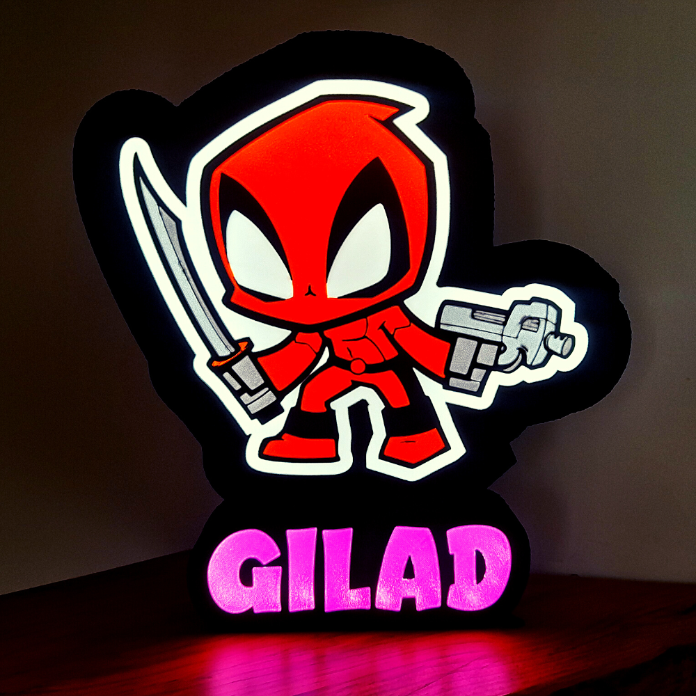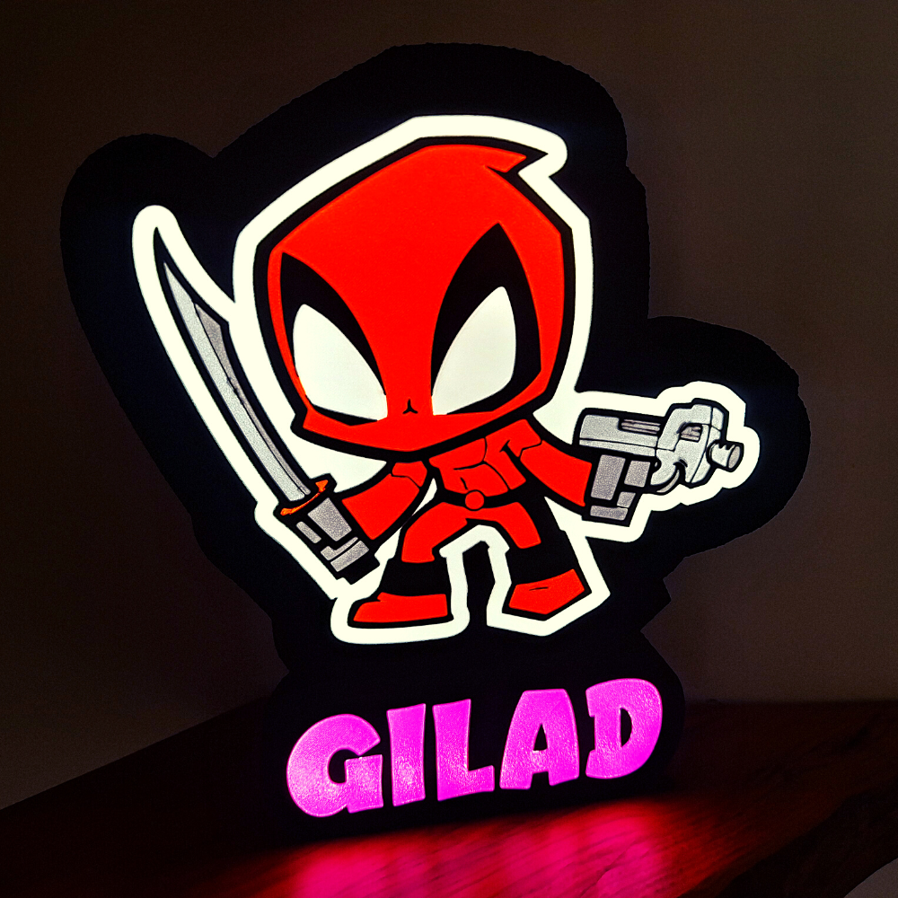 מעוניינים בגוף תאורה דקורטיבי ייחודי, צבעוני בדמותו של דדפול גיבור העל, אישי עם שם של ילד, בן משפחה או חברים?