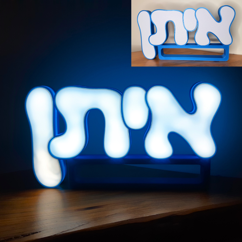 שם או מילה שתבחרו, בעברית או אנגלית, תלת מימדית מוארת בתאורת לד לבנה. האותיות בגובה כ- 10 ס"מ.
